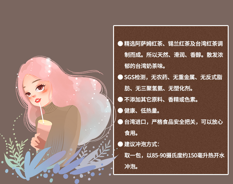 ●精選阿薩姆紅茶、錫蘭紅茶調(diào)制而成。所以天然、滑潤(rùn)、香醇。散發(fā)濃郁的臺(tái)灣奶茶味